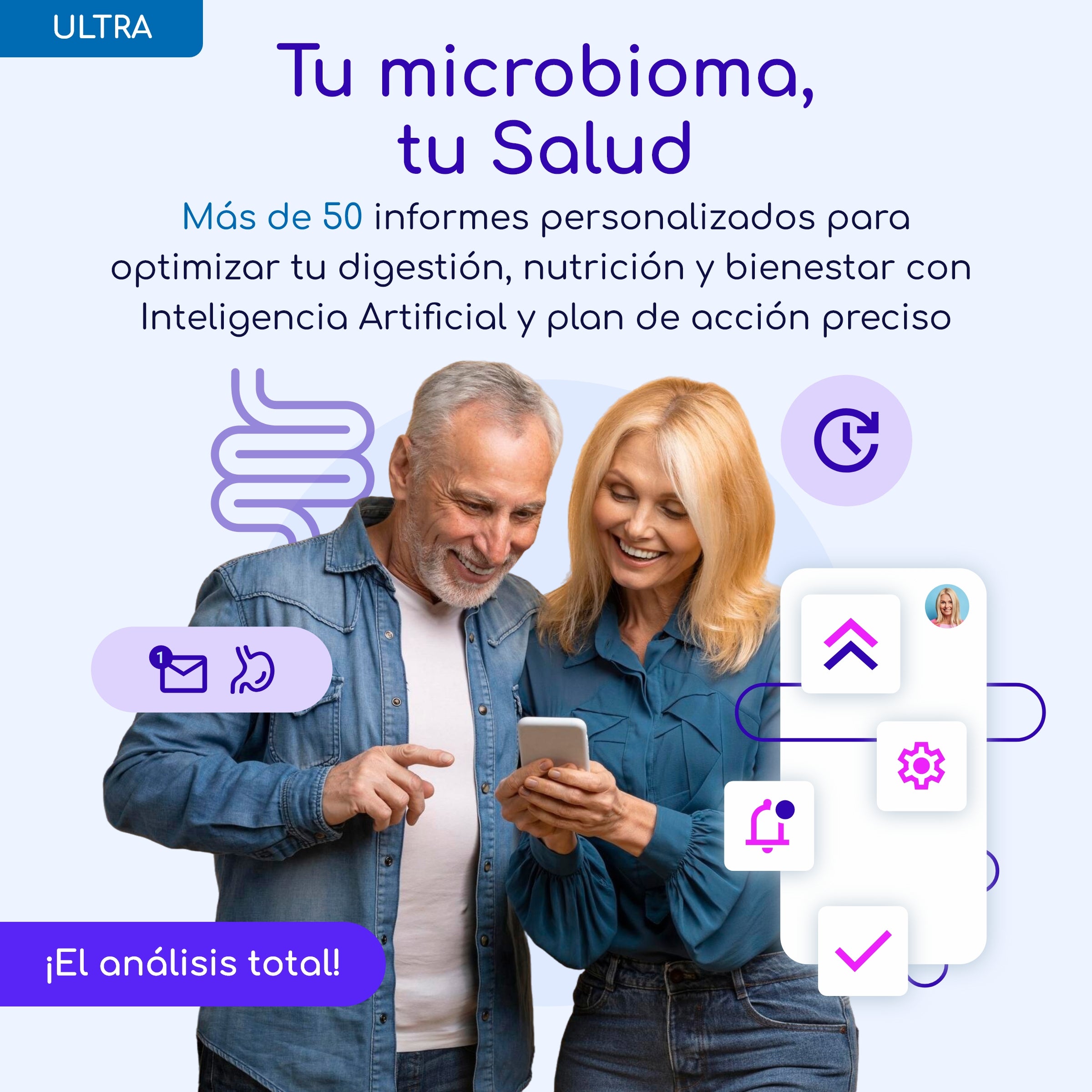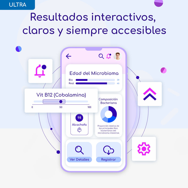 Vivabioma Ultra no solo te muestra tus resultados, sino que también te proporciona recomendaciones precisas basadas en inteligencia artificial, personalizando tu salud de acuerdo con tu microbioma. Desde tu riesgo de enfermedades hasta tus superalimentos ideales, todo está cubierto.
