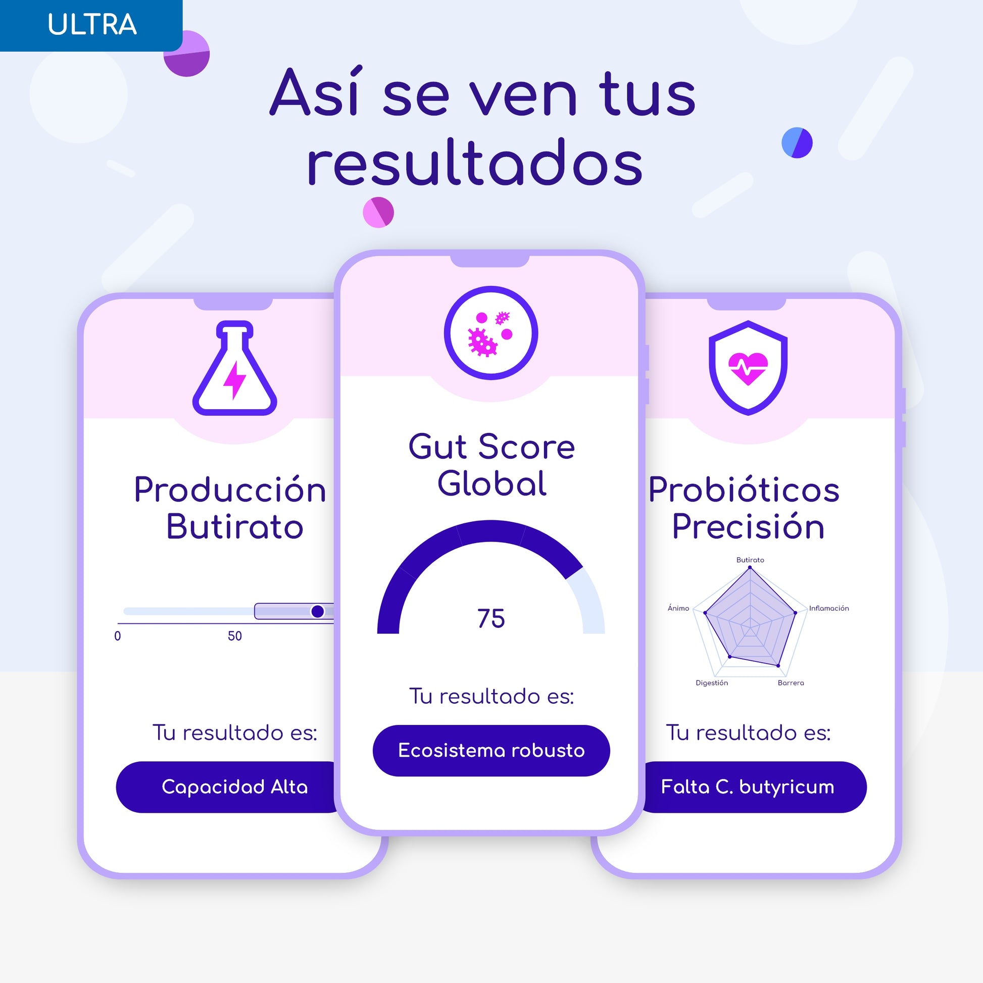 Gut Score: evaluación de tu bienestar intestinal a través de un puntaje que refleja la diversidad y el equilibrio de tu microbioma.